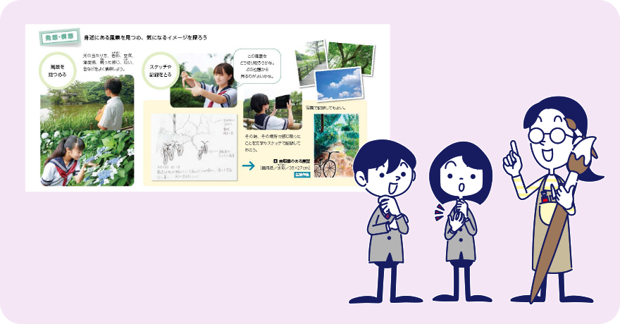 生徒たちにとって親しみのある作品を多く掲載しているので、生徒の興味・関心を高め、主体的な学習につなげることができます。また、デジタルコンテンツを活用することで、発想・構想の広がりをサポートし、生徒の「表現したい」「もっと知りたい」という思いに応えます。